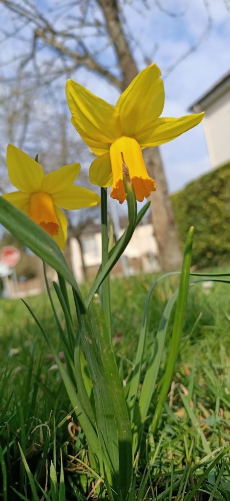 Sous la lumière bienveillante du soleil, deux jonquilles éclatantes déploient leurs pétales jaunes vifs, comme une ode à la vie et à la renaissance. Ces fleurs symbolisent non seulement l’arrivée du printemps, mais aussi l’espoir et la beauté qui émergent après les périodes plus sombres.