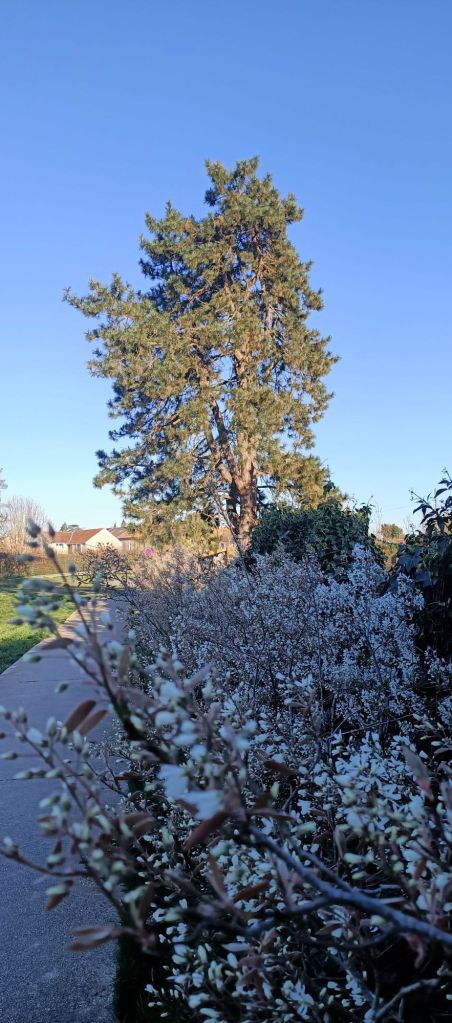 Un grand pin majestueux s’élève fièrement sous un ciel bleu dégagé, créant une scène sereine qui invite à la contemplation. À l’avant-plan, des buissons en fleurs ornés de petites fleurs blanches ajoutent une touche de douceur et de délicatesse à l’environnement. En arrière-plan, des maisons et une route s’intègrent harmonieusement, reliant la beauté naturelle à la vie quotidienne.
